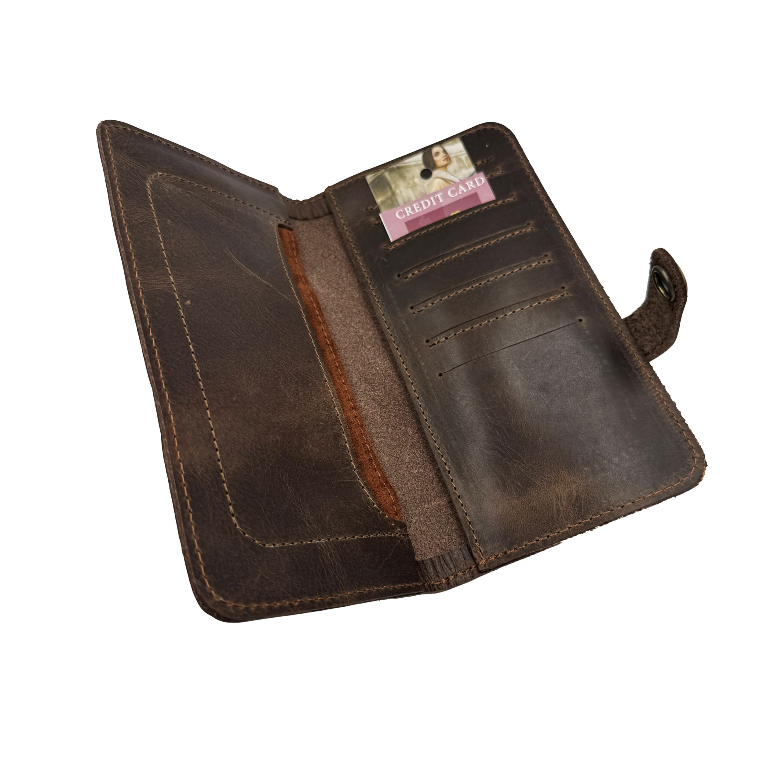 Δερμάτινο γυναικείο πορτοφόλι από Δέρμα εξαιρετικής ποιότητας σε ποικιλία χρωμάτων πορτοφόλι με πολλαπλούς χώρους τοποθέτησης χαρτονομισμάτων, εγγράφων, κερμάτων, ταυτότητας και καρτών, που ασφαλίζονται  με μεταλλικά κουμπώματα. Χρησιμοποιήθηκαν δέρματα φυτικής δέψης (υψηλής ποιότητας μέθοδος επεξεργασίας δερμάτων), χωρίς τη χρήση τοξικών χημικών ουσιών που προκαλούν σημαντική βλάβη στο περιβάλλον.